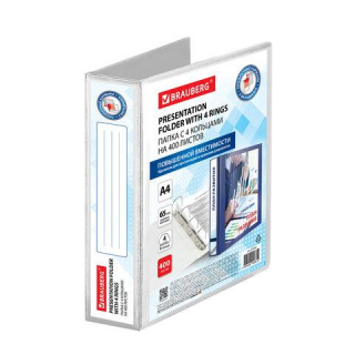 Папка ПАНОРАМА на 4 кольцах, ПРОЧНАЯ, картон/ПВХ, BRAUBERG Office, БЕЛАЯ, 65мм, до 40