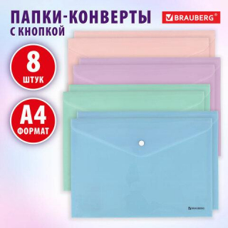 Папка-конверт с кнопкой А4 КОМПЛЕКТ 8 шт, пастельные цвета ассорти, BRAUBERG PASTEL, 0,18 мм, 272865