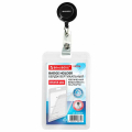 Тип бейджа: классический, Тип крепления: держатель с рулеткой, Положение: вертикальное, Количество в комплекте: 1 шт., Размер вкладыша (ДхШ): 85х54 мм, Размер бейджа (ДхШ): 110х67 мм, Серия: EXTRA, Цвет крепления: черный, Материал корпуса: твердый пластик, Цвет корпуса: прозрачный, Длина нити в держателе-рулетке: 70 см, Наличие картонной вставки: да