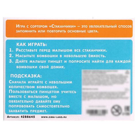 Набор «Сортер-стаканчики: цветные бомбошки» рекомендован детям старше 3 лет. Играть следует под присмотром родителей.